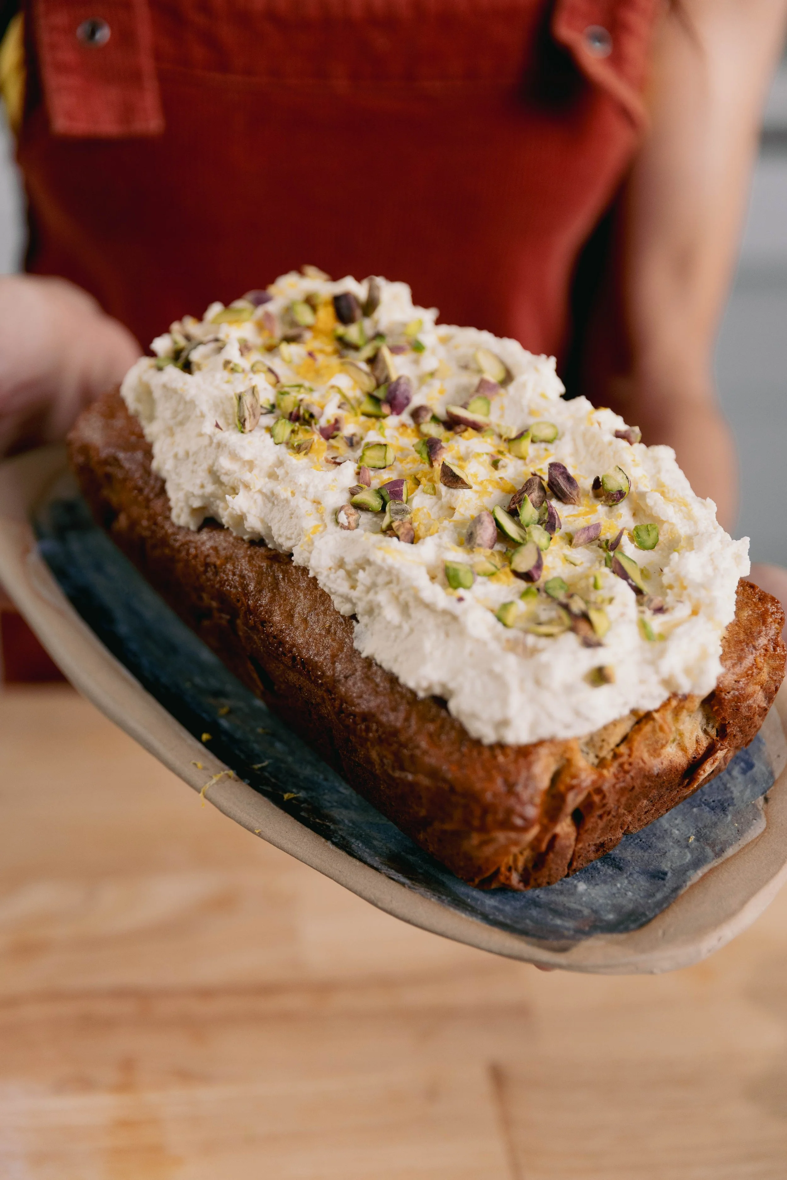 To finish, dollop the frosting over the cooled loaf. Garnish with lemon zest, and crushed pistachios.